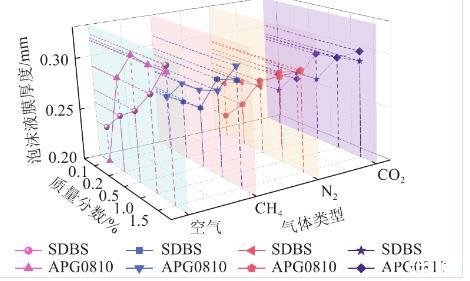 在溶液質(zhì)量分?jǐn)?shù)較高時SDBS溶液產(chǎn)生的泡沫液膜厚度有略大于APG0810的趨勢,注入空氣條件下,質(zhì)量分?jǐn)?shù)0.15%時SDBS和APG0810溶液泡沫液膜厚度分別為0.321 mm和0.315 mm,兩者僅相差0.006 mm。這是由于隨著溶液濃度增大,APG0810已臨近臨界膠束濃度,而SDBS臨界膠束濃度大于APG0810,所以在質(zhì)量分?jǐn)?shù)為0.15%時,APG0810溶液產(chǎn)生的泡沫液膜厚度已變化不明顯,而SDBS溶液泡沫液膜仍然有提高聚集水分子的能力,導(dǎo)致液膜厚度增加。