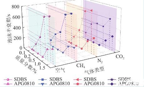 空氣、甲烷及氮?dú)獾姆€(wěn)泡性規(guī)律大致相同,注入空氣情況下,SDBS溶液質(zhì)量分?jǐn)?shù)為0.15%時泡沫半衰期約為786.5 s,二氧化碳注入液體的穩(wěn)泡性明顯下降,質(zhì)量分?jǐn)?shù)為0.15%時為584 s,比空氣低202.5 s。推測這是由于二氧化碳為酸性氣體,表面活性溶液在酸性環(huán)境下泡沫穩(wěn)定性不足,泡沫液膜強(qiáng)度不易控制酸性氣體造成的。而APG0810表面活性劑溶液泡沫半衰期在四種氣體注入情況下差異不明顯,是由于APG0810為非離子表面活性劑,在溶液中不是以離子狀態(tài)存在,由此可以推出它的穩(wěn)定性高,不易受強(qiáng)電解質(zhì)影響,也不易受酸、堿影響。