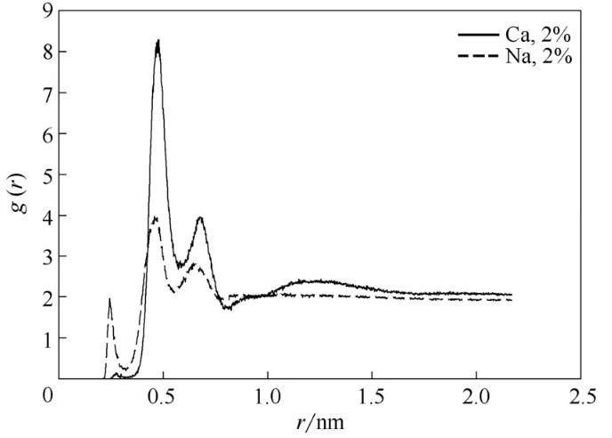 進(jìn)一步分析OPES對(duì)Na+、Ca2+抗鹽性的差別,考察了磺酸基中的氧原子與Na+、Ca2+的徑向分布函數(shù),如圖11所示。圖中兩曲線的峰值出現(xiàn)較大差距,其中Na+曲線的峰值明顯小于Ca2+曲線的峰值,這表明親水基團(tuán)與Na+的作用較小,也就是說Na+對(duì)OPES的性質(zhì)影響較小。因此,辛基酚聚氧乙烯醚磺酸鹽的抗鹽性順序?yàn)镹a+>Ca2+,與對(duì)序參數(shù)所做的分析結(jié)論相同。