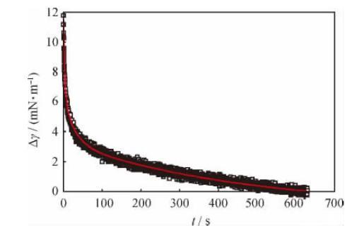 當(dāng)活性分子界面吸附膜達(dá)到平衡時(shí),對其實(shí)施一個(gè)突然的擾動,則界面上各活性分子均會對此擾動產(chǎn)生響應(yīng)。界面和體相間分子交換的快慢、分子在界面上排列的變化、分子間相互作用的強(qiáng)弱等信息均會反映在擾動停止后的界面張力衰減曲線上。典型的界面張力(Δγ)衰減曲線及其擬合曲線如圖1所示。