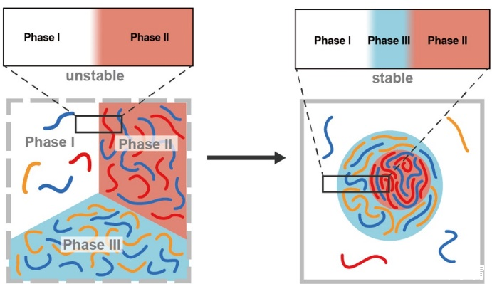 有別于簡單兩組分(聚陰離子與聚陽離子)體系,多組分聚電解質(zhì)體系會(huì)發(fā)生多相復(fù)合凝聚而出現(xiàn)共存的多個(gè)凝聚相,它們形成嵌套型或串珠型等各種多級分層結(jié)構(gòu),這些結(jié)構(gòu)的形成與生命體系中的分子定位、定向招募相關(guān),也是蛋白質(zhì)翻譯和核仁應(yīng)激反應(yīng)的結(jié)構(gòu)基礎(chǔ)。決定凝聚物體系采取何種多級液滴結(jié)構(gòu)的關(guān)鍵因素正是不同共存相間的界面張力。因此,深入研究多相凝聚體系的界面張力具有非常重要的價(jià)值。當(dāng)前理論僅處理簡單兩組分體系形成的稀相與濃相間的界面,多相分離體系的界面張力尚未得到解決。