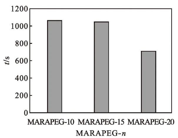 馬來酰蓖麻油酸聚乙二醇(n=10、15、20)酯的潤濕性能如圖5所示。由圖5可知:產(chǎn)品的潤濕時間隨著聚乙二醇聚合度的增大而增長。氧乙基數(shù)增加,其親水性增強(qiáng),降低表面張力的能力減弱,潤濕性能減弱。