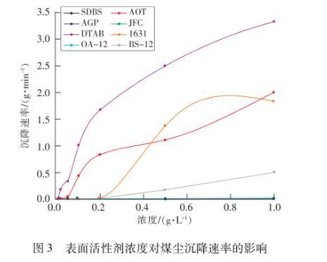 由表4和圖3可以看到,當(dāng)濃度為0.1 g/L時,煤塵在AOT和APG溶液中的沉降時間不到1 min,而在陽離子和兩性型表面活性劑溶液中的沉降時間超過1 h。在同一濃度下,煤塵在不同表面活性劑溶液中的沉降時間相差較大,表面活性劑自身性質(zhì)影響潤濕煤塵的作用。當(dāng)濃度增大到各表面活性劑的臨界膠束濃度附近時,煤塵在陰離子和非離子表面活性劑中的沉降時間會急劇下降,縮短至5 min之內(nèi),但在陽離子和兩性型表面活性劑中沉降時間依然大于1 h??傮w而言,8種表面活性劑潤濕煤塵的能力由強(qiáng)到弱依次排序為:APG>AOT>JFC>SDBS>OA-12>BS-12>1631>CTAB,這與表面活性劑降低表面張力的能力排序基本一致。陽離子表面活性劑潤濕煤塵效果最差,主要是因為親水頭基的正電荷與煤塵所帶負(fù)電荷之間的靜電力大于疏水基團(tuán)之間的范德華力,形成了親水基團(tuán)朝向煤塵表面、疏水基團(tuán)朝向水的單分子膜,不利于潤濕。APG潤濕煤塵效果最好主要與其自身結(jié)構(gòu)有關(guān),APG分子結(jié)構(gòu)碳原子上的醇羥基與水分子之間存在強(qiáng)烈相互作用,間接弱化了烷基糖苷分子結(jié)構(gòu)中親水基團(tuán)與煙煤表面含氧親水官能團(tuán)之間的吸附作用,更有利于疏水基團(tuán)與煤塵表面的疏水基團(tuán)發(fā)生強(qiáng)烈相互作用,以親水頭基伸向溶液,疏水尾部吸附在煤塵上的方式排列,降低了溶液及固-液界面張力,增加了煤塵親水性。APG濃度達(dá)到0.02 g/L時,煤塵沉降時間僅為057 min,沉降速率為0.18 g/min,潤濕煤塵效果良好,當(dāng)濃度繼續(xù)增大,潤濕煤塵作用變化不大,綜合考慮成本及效率后,選擇濃度為0.02 g/L的APG作為低階煤用噴霧抑塵法的添加劑。