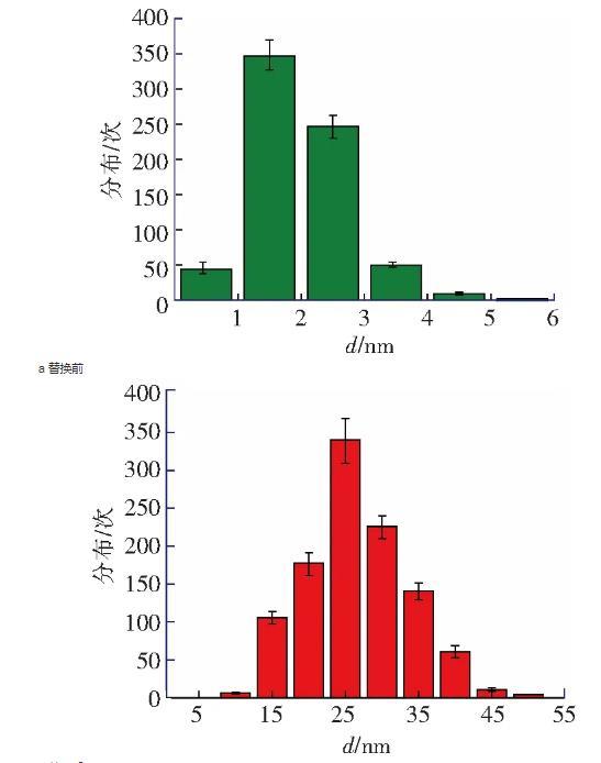 納米氣泡的高度在8~20 nm范圍之內,直徑在100~500 nm范圍之內,圖3c為圖3b中典型納米氣泡的截面圖。掃描得到納米氣泡圖像以后,在該表面上進行力曲線測量實驗,如圖2b所示。所有離曲線的‘跳進’距離均大于10 nm且是變化的,同時,由雙電層引起的斥力也消失了,不符合DLVO理論。這種‘跳進’距離不同的長程力應該是因為醇-水替換后HOPG表面上生成的納米氣泡造成的。圖3b中納米氣泡的覆蓋率約為21.8%,在該表面不同位置測量得到的力曲線必然會存在探針-HOPG相互作用的情況,即不都是探針-氣泡的相互作用的情況。然而,根據(jù)醇-水替換前后多次測量力曲線得到“跳進”距離d的統(tǒng)計分析(圖4a和圖4b),醇-水替換前測量得到的力曲線的“跳進”距離大部分都小于5 nm(99%),而醇-水替換后測得的力曲線的“跳進”距離均大于10 nm。這表明,醇-水替換后即使不是探針-氣泡相互作用的情況下,探針與HOPG表面的相互作用時仍然存在長程引力,而這應該是IGE造成的。該研究結果與Peng等人的研究結果一致,驗證了Limbeek對IGE與納米氣泡共存的假設。