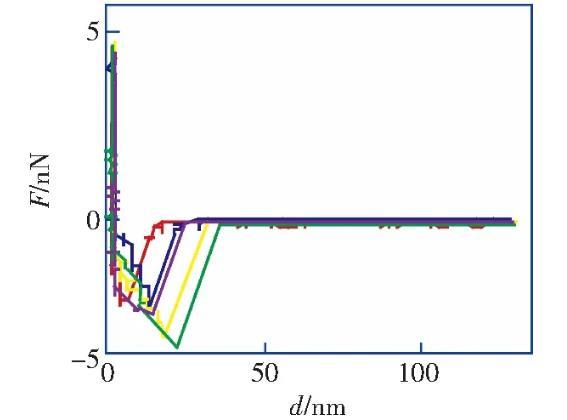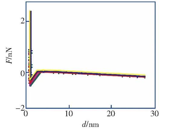 筆者利用原子力顯微鏡實驗測量了HOPG表面在醇-水替換前后的力距離曲線,發(fā)現(xiàn)醇-水替換前進針曲線的跳進距離小于5 nm,滿足DLVO理論;而在醇-水替換后納米氣泡覆蓋率為21.8%的情況下,進針曲線的跳進距離均大于10 nm,不能再用DLVO理論解釋,證明了IGE與納米氣泡共存這一現(xiàn)象。根據(jù)改進的Laplace-Young方程,結合文獻中對納米氣泡線張力值的計算結果,分析負的線張力對過渡區(qū)內局部表面張力及局部固-液界面的影響,導致納米氣泡的接觸角反常小的原因之一。分析并討論雜質對納米氣泡接觸角的影響,指出IGE與納米氣泡共存、線張力及雜質影響的共同作用是導致納米氣泡接觸角“反常小”的原因。