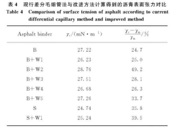 表4現(xiàn)行差分毛細(xì)管法與改進(jìn)方法計(jì)算得到的瀝青表面張力對比