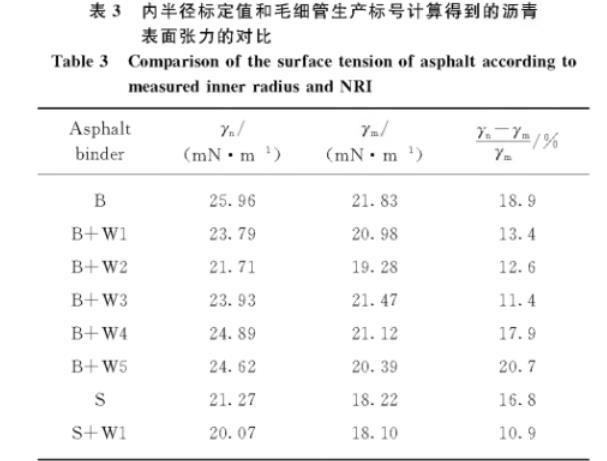 表3內(nèi)半徑標(biāo)定值和毛細(xì)管生產(chǎn)標(biāo)號計(jì)算得到的瀝青表面張力的對比