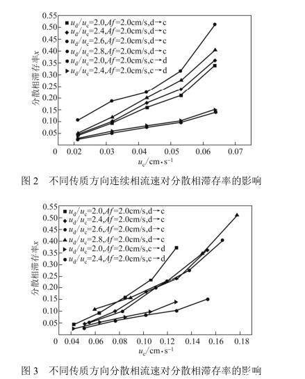 圖5是篩板在不同振動(dòng)速率下的分散相滯存率變化情況。圖中結(jié)果顯示:分散相滯存率隨著篩板振動(dòng)速率Af的增加而增大。振動(dòng)的篩板對(duì)液滴有強(qiáng)烈的剪切作用,加速了液滴破碎、聚并和再破碎過(guò)程,固分散相滯存率隨Af增大。