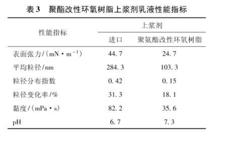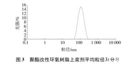 制備的聚酯改性環(huán)氧樹脂上漿劑乳液性能見表3,粒徑及分布測試結(jié)果見圖3。