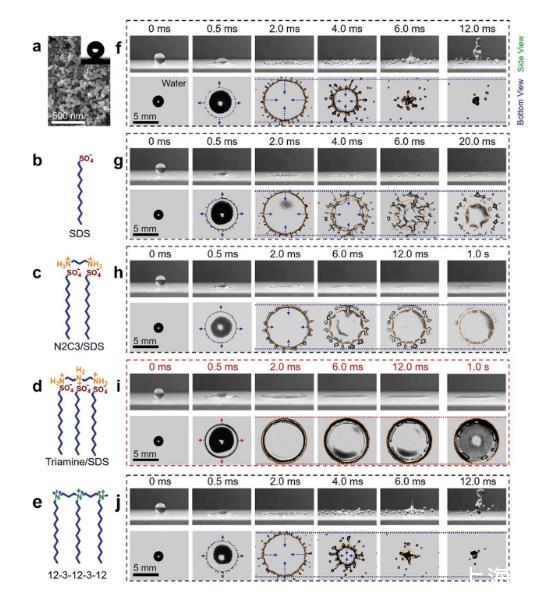 圖1.高速液滴撞擊超疏水表面的動(dòng)態(tài)行為。a)掃描電子顯微鏡(SEM)揭示了表面的微觀結(jié)構(gòu)。插圖:水接觸角為161.3±1.1°,確保超疏水性。b–e)表面活性劑的分子結(jié)構(gòu)。f)撞擊超疏水表面的水滴出現(xiàn)飛濺和反彈。g–j)分別含有SDS、N2C3/SDS、三胺/SDS和12-3-12-3-12添加劑的水滴在超疏水表面上的撞擊動(dòng)力學(xué)的側(cè)面和仰視圖。g,h)含有SDS或N2C3/SDS添加劑的液滴抑制了反彈,但仍會(huì)產(chǎn)生飛濺或后退破碎。i)含有三胺/SDS的液滴一旦與基材接觸就會(huì)形成穩(wěn)定的周邊邊緣,隨后完全沉積在超疏水表面上而不會(huì)發(fā)生任何飛濺或碎裂。完全均勻的潤(rùn)濕膜在達(dá)到最大擴(kuò)散面積后保持不變。j)合成低聚表面活性劑12-3-12-3-12添加劑對(duì)水滴的影響影響不大。濺射和反彈仍然會(huì)發(fā)生。箭頭的長(zhǎng)度表示擴(kuò)散或反彈速度的變化。
