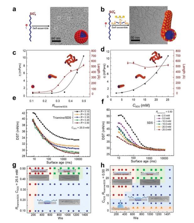 圖2.撞擊結(jié)果的物理化學(xué)性質(zhì)和相圖。a,b)SDS和三胺/SDS聚集狀態(tài)的示意圖和低溫透射電鏡圖像。a)單獨(dú)的SDS形成小的球形膠束,用虛線矩形突出顯示。b)加入三胺后,三胺/SDS形成長(zhǎng)而密集的纏結(jié)線性膠束。c,d)在不同摩爾比R和摩爾濃度CSDS下三胺/SDS的粘度和聚集長(zhǎng)度。在臨界摩爾比或摩爾濃度之后,膠束伸長(zhǎng)并纏結(jié)成網(wǎng)絡(luò)結(jié)構(gòu),導(dǎo)致粘度急劇增加。e,f)不同R和CSDS下三胺/SDS的動(dòng)態(tài)表面張力(DST)曲線。隨著R和CSDS的增加,初始和平衡表面張力均顯著降低。g,h)不同We數(shù)下三胺/SDS液滴撞擊超疏水表面的動(dòng)態(tài)行為相圖。在高We下,含有三胺/SDS添加劑的液滴只有在特定的摩爾比(0.45–0.50)和特定的摩爾濃度(>20.0×10?3 m)下才能完全沉積在超疏水表面上。