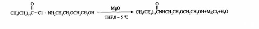 1.2.1棕櫚酸二甘醇酰胺的合成稱取9.10 g二甘醇胺,放入裝有攪拌器、溫度計和恒壓漏斗的500 mL三口燒瓶中,并加入約70 mL水。通過冰浴將溫度控制在0~5℃范圍內(nèi),加入溶劑210 mL(V(水)∶V(四氫呋喃)=1∶3)及氧化鎂16.80 g(n(氧化鎂)∶n(二甘醇胺)=5∶1)。攪拌約30 min后,稱取22.88 g棕櫚酰氯溶解于70 mL四氫呋喃,轉(zhuǎn)移到恒壓漏斗中,緩慢滴加到三口瓶中,滴加時間為0.5 h左右,在0~5℃下攪拌反應(yīng)2~2.5 h。反應(yīng)物物質(zhì)的量比為n(棕櫚酰氯)∶n(二甘醇胺)=1∶1.02。反應(yīng)結(jié)束后將反應(yīng)混合物倒入布氏漏斗中抽濾,除去過量的氧化鎂和生成的氯化鎂,收集濾液,旋蒸除去溶劑,最后于55℃下真空干燥12 h,得到目標(biāo)產(chǎn)物,外觀為白色粉末。