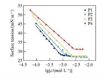 為研究4種非離子Gemini表面活性劑的表面活性,采用液滴體積法測定了不同濃度下的表面張力。圖2示出P1,P2,P3和P4的溶液表面張力與濃度對數(shù)的關系。溶液的表面張力隨濃度的增加而降低,當溶液的濃度高于cmc后,表面張力達到最低值并基本趨于穩(wěn)定。這是由于隨著表面活性劑濃度的升高,在氣/液界面上吸附的表面活性劑分子數(shù)量增多,界面上的分子排列越來越緊密,表面張力持續(xù)下降;當表面活性劑濃度達到cmc后,溶液內(nèi)部的分子開始聚集形成膠束聚集體,表面活性劑分子在界面上達到飽和吸附,因此cmc之后表面張力趨于穩(wěn)定。