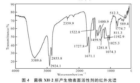 菌株XH-2所產(chǎn)生物表面活性劑的紅外光譜如圖4所示。