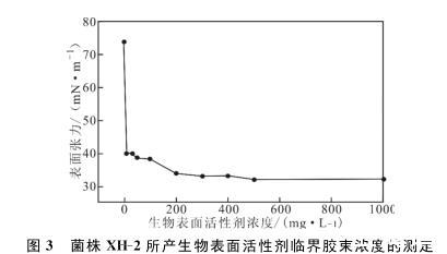 菌株XH-2所產(chǎn)生物表面活性劑具有溫度、pH值和鹽度穩(wěn)定性,其臨界膠束濃度為200 mg·L-1,明顯低于常用的化學表面活性劑,具有良好的工業(yè)應用價值。