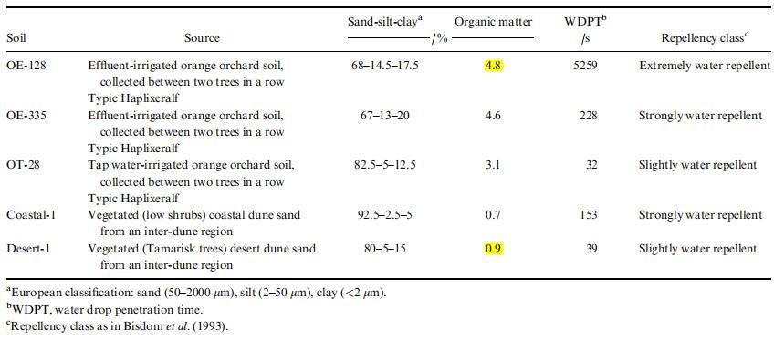 來自以色列不同地區(qū)的五種防水土壤 過篩(1 毫米)并在室溫下儲(chǔ)存在玻璃容器中 實(shí)驗(yàn)室條件(平均溫度 ? 24.5°C,平均 相對(duì)濕度 (RH) ? 65%)。 兩種土壤 (OE-128 和 OE-335; 典型的單氟草胺)是從相同的 污水灌溉的商業(yè)柑橘園與以前一樣 研究(Wallach 等人,2005 年;Graber 等人,2006 年)位于 以色列沿海平原的中部(31°59¢30.562)。 一 土壤(OT-28;典型單頭草)是從水龍頭中獲得的 同一商業(yè)果園的水灌溉柑橘地塊。 一種 沙丘沙是從附近的沙丘間地區(qū)獲得的 位于地中海的尼察尼姆自然保護(hù)區(qū) (31°16¢37.242) 海(Coastal-1)和來自沙間地區(qū)的粘土砂 內(nèi)蓋夫北部沙漠 (30°52¢02.592; (Desert-1) 的 Halutza 附近。表 1 列出了顯著的土壤特征。
