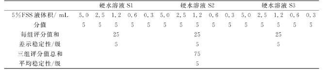 參照GB 7381-87所述方法,對(duì)合成得到的氟硅表面活性劑FSS在硬水中的穩(wěn)定性進(jìn)行了測定,結(jié)果如表3.