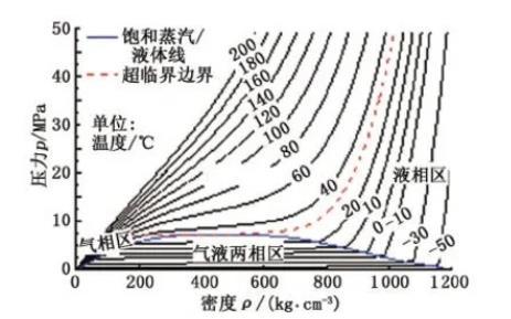 表面活性劑水溶液的密度與純水體系相近,其密度根據(jù)飽和水蒸氣溫度-壓力-密度-熱力學(xué)參數(shù)對照表確定,CO2密度與壓力溫度的關(guān)系見圖3。