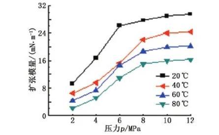 圖7不同溫度下擴(kuò)張模量隨壓力的變化關(guān)系