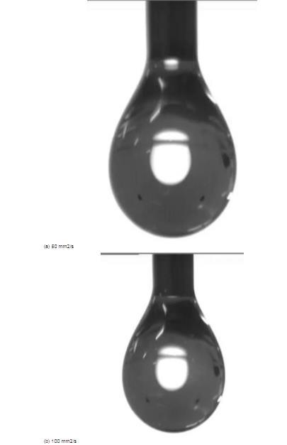 根據(jù)液滴的形成過(guò)程,實(shí)驗(yàn)選用液滴下落前的臨界懸停狀態(tài)圖像,進(jìn)一步測(cè)量了不同黏滯性硅油的表面張力系數(shù),圖4為黏度系數(shù)為50、100、350和500 mm2/s硅油樣品的懸滴形態(tài)照片。
