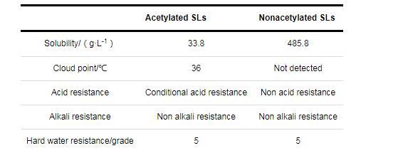 表3乙?;疭Ls和去乙酰化SLs的溶解性能和抗酸抗堿性