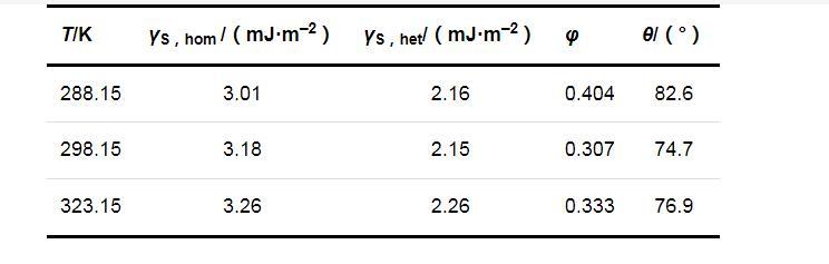 兩種成核機制時的固-液界面張力(γS,hom和γS,het)、形狀因子(φ)和接觸角(θ)的計算結(jié)果列于表2.可以看出,在同一溫度下,均相成核時的固-液界面張力大于非均相成核時的固-液界面張力;溫度對固-液界面張力的影響并不明顯,固-液界面張力只隨溫度的升高略有增加.