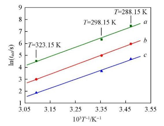 Liu和Nancollas[32]提出了一個反映成核誘導期(tind)與溫度關(guān)系的經(jīng)驗方程式: