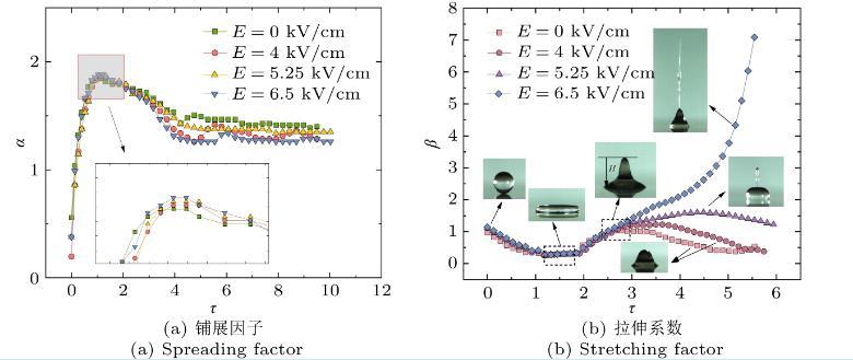 為了更詳細地研究垂直電場對液滴鋪展的影響,根據(jù)實驗獲得的連續(xù)照片分別測量了液滴演變過程中動態(tài)鋪展直徑L。圖3(a)描述了無電場和三種不同模式下液滴的鋪展因子α隨無量綱時間τ的變化。液滴撞擊后在短時間內(nèi)擴散并且?guī)缀跬瑫r達到最大鋪展?fàn)顟B(tài),隨后液滴開始回縮,對應(yīng)的鋪展因子趨勢下降,最后進入液滴振蕩階段,由于液滴和表面的釘住作用,鋪展因子逐漸趨于穩(wěn)定。從圖3(a)可以看出,不同場強下的液滴在τ=1.19時達到最大鋪展,并且最大鋪展因子隨著電場強度的增加而小幅度增大,這是因為分布在液滴表面上的同類自由電荷之間的庫侖斥力會引入與表面張力相反方向的靜電力,額外的靜電力會減弱液體表面張力,進一步增強液滴的擴散。無電場與場強最大的液滴的最大鋪展因子相差小于2%,說明在液滴鋪展階段,電場力不是主導(dǎo)影響因素,這與前人的研究結(jié)果保持基本一致。
