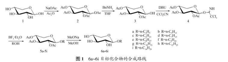 采用全乙?;哪咎?2)在四氯化錫催化下與一系列脂肪醇發(fā)生偶聯(lián)反應(yīng),對時間要嚴格控制,否則有部分轉(zhuǎn)化成α-異構(gòu)體,當時間過長時,還會形成以α-糖苷為主的產(chǎn)物和少量2-位脫保護的糖苷副產(chǎn)物。參考烷基-β-D-葡萄糖苷等合成與性能研究成果,按照Scheme1所示的路線,以D-木糖(1)為原料通過乙酰化、脫1-位乙?;?、與三氯乙腈反應(yīng),得到相應(yīng)的三氯乙酰亞胺酯(4)。采用易于構(gòu)筑1,2-反式糖苷鍵的三氯乙酰亞胺酯法,以三氟化硼乙醚作糖苷化偶聯(lián)反應(yīng)的催化劑,使得具有鄰基參與效應(yīng)的三氯乙酰亞胺酯(4)與相應(yīng)的脂肪醇反應(yīng)及相應(yīng)的脫乙?;Wo,合成一系列烷基-β-D-吡喃木糖苷,如圖1所示。本文作者對其溶解性、表面張力、乳化性能、液晶性能、熱穩(wěn)定性等理化性質(zhì)進行研究。