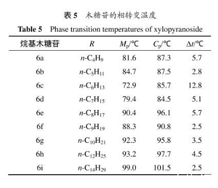 具有液晶特征的化合物因加熱而呈現(xiàn)所謂的“雙熔融轉(zhuǎn)變”的相變現(xiàn)象,當(dāng)加熱達(dá)到其熔點(diǎn)(p)時,結(jié)晶性的固態(tài)首先轉(zhuǎn)變成半透明的液晶態(tài),接著在較高的溫度(p)下轉(zhuǎn)變成各向同性的清亮的液態(tài)。表5所示為木糖苷的相轉(zhuǎn)變溫度。從表5可見:烷基-β-D-吡喃木糖苷屬于一頭一尾(one head one tail)或一頭組一鏈(one head group-one chain)且呈現(xiàn)多態(tài)性的雙親吡喃糖苷分子,在加熱時其相變發(fā)生在相對較小的溫度區(qū)間,但都出現(xiàn)了液晶相,且當(dāng)疏水性烷基碳鏈長度為6時,烷基-β-D-吡喃木糖苷相變溫度之差(Δ)較大,其他的都比較接近。在木糖苷中,烷基有助于提升分子取向的穩(wěn)定性,且這種穩(wěn)定性對液晶相的生成是必要的。但由于烷基-β-D-吡喃木糖苷為環(huán)狀的糖苷只有3個游離羥基,比烷基--D-吡喃葡萄糖苷少了親水性頭部的糖環(huán)上的羥甲基,也比木糖醇的十二烷基單醚少了1個游離的羥基,清亮點(diǎn)p不高,所以,得到的烷基-β-D-吡喃木糖苷具有液晶相,但相變溫度范圍(?=p?p)較窄,液晶相的穩(wěn)定性較弱。