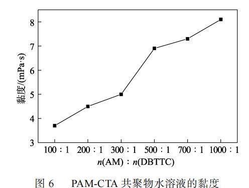 由圖6可知,隨著DBTTC用量的減少,共聚物水溶液黏度緩慢提升,由3.7 mPa·s逐漸升高到8.1 mPa·s,這是因?yàn)椋S著RAFT試劑用量的減少,共聚物相對(duì)分子質(zhì)量增加,共聚物鏈段增長(zhǎng),共聚物鏈段之間的纏繞作用增強(qiáng),共聚物水溶液黏度升高。適當(dāng)?shù)卣{(diào)節(jié)RAFT試劑的用量可以達(dá)到控制共聚物水溶液黏度的目的。