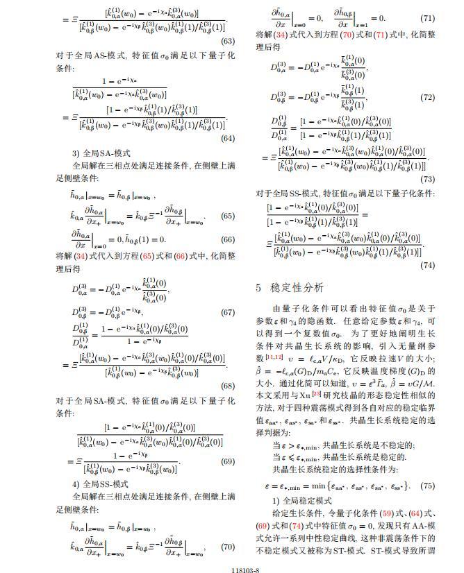 將系統(tǒng)方程以振幅遠(yuǎn)小于1進(jìn)行線性化處理,結(jié)合(1)式—(4)式,可以得到共晶生長(zhǎng)系統(tǒng)的擾動(dòng)態(tài)滿足以下控制方程和邊界條件: