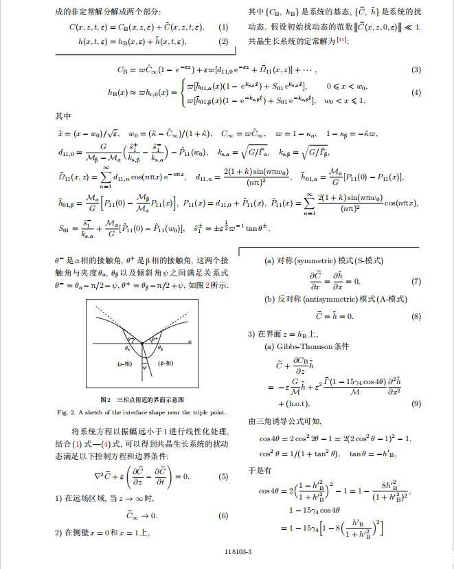 固體材料本身并非各向同性介質(zhì),其晶格結(jié)構(gòu)使固體體內(nèi)的物理量以及表面的物理參數(shù)依賴于取向,變?yōu)楦飨虍愋粤?固體材料這些物理參量的各向異性特征對(duì)凝固過(guò)程動(dòng)力學(xué)與界面穩(wěn)定性機(jī)理以至對(duì)界面微結(jié)構(gòu)圖案的形成與選擇造成重要的影響[14].王志軍等[15,16]研究了各向異性表面張力對(duì)定向凝固過(guò)程中初始平界面穩(wěn)定性的影響,發(fā)現(xiàn)各向異性表面張力的非線性效應(yīng)導(dǎo)致界面傾斜生長(zhǎng).Chen等[17]研究了各向異性表面張力對(duì)定向凝固過(guò)程中球晶生長(zhǎng)的影響,發(fā)現(xiàn)在各向異性表面張力作用下,球晶生長(zhǎng)初始階段部分界面首先向內(nèi)移動(dòng),達(dá)到一定的熔化深度后向外移動(dòng).Xu[18]研究了各向異性表面張力對(duì)定向凝固過(guò)程中枝晶生長(zhǎng)的影響,發(fā)現(xiàn)當(dāng)存在各向異性表面張力時(shí),枝晶系統(tǒng)具有兩種不同的整體不穩(wěn)定性機(jī)理:震蕩不穩(wěn)定性與低頻不穩(wěn)定性.陳明文等[19]研究了各向異性表面張力對(duì)定向凝固過(guò)程中深胞晶生長(zhǎng)的影響,發(fā)現(xiàn)當(dāng)各向異性表面張力增大時(shí),深胞晶界面全長(zhǎng)增大,根部低端的曲率半徑增大.本文應(yīng)用多重變量展開(kāi)法研究各向異性表面張力條件下定向凝固共晶生長(zhǎng)形態(tài)穩(wěn)定性,揭示了各向異性表面張力對(duì)共晶生長(zhǎng)不穩(wěn)定性區(qū)域大小的影響.