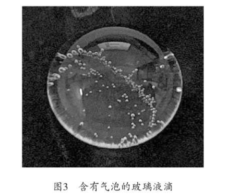 玻璃試樣要保證化學(xué)組成的均勻性,且內(nèi)部不能包含缺陷(氣泡、結(jié)石和條紋等)。如有氣泡會(huì)導(dǎo)致玻璃熔體體積失真,如圖3所示。氣泡中的氣體受熱會(huì)進(jìn)一步膨脹,使玻璃液滴體積增大,導(dǎo)致玻璃液滴在測試溫度下的密度偏低,最終影響玻璃熔體表面張力的測試結(jié)果。玻璃條紋和結(jié)石等缺陷也是玻璃成分不均的表現(xiàn),在受熱條件下影響玻璃熔體液滴形態(tài),導(dǎo)致無法獲得中心旋轉(zhuǎn)軸對(duì)稱的玻璃液滴,因此應(yīng)選擇無內(nèi)在質(zhì)量缺陷的玻璃。