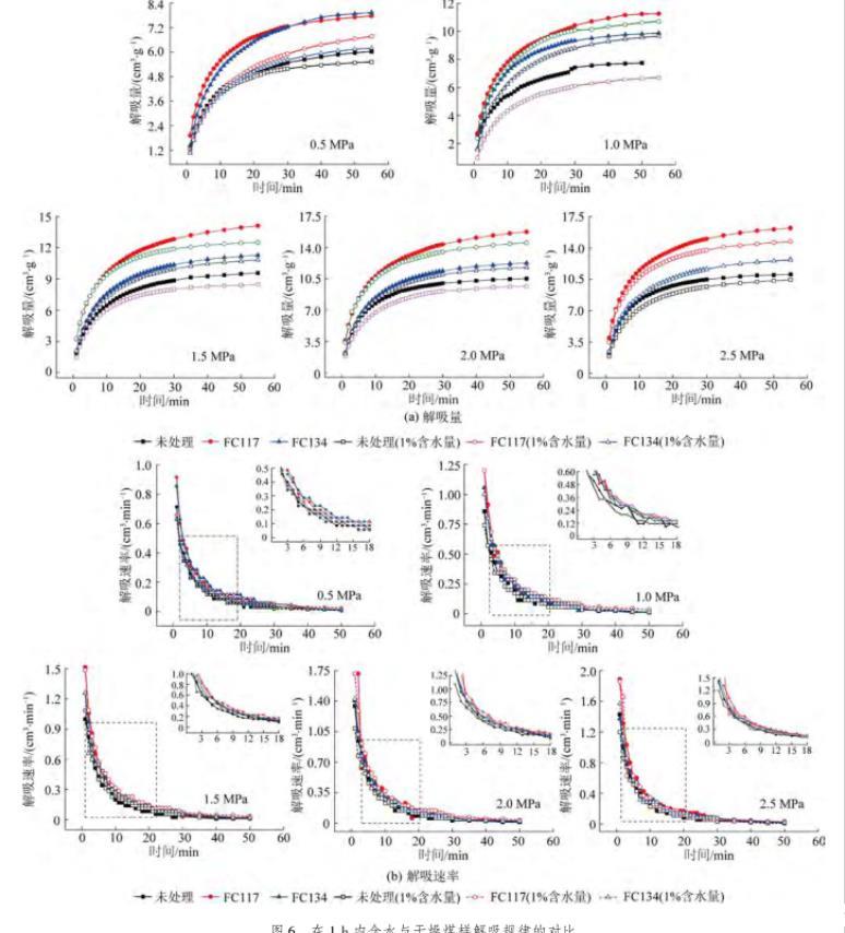 通過對干燥與含水煤樣解吸量和解吸速率的分析,經(jīng)過氣潤濕反轉劑——FC117和FC134處理后的煤樣解吸量和解吸速率均有所提升,其中FC117的效果更加顯著。同時,經(jīng)過表面活性劑處理后,煤樣的潤濕性發(fā)生轉變,水鎖效應得到緩解和消除。含水煤樣的解吸量和解吸速率也均大于未處理的干燥煤樣。定量地分析了表面活性劑改變煤體表面潤濕性,由親水性向疏水性轉變,緩解水鎖損害,進而增加煤樣解吸量。