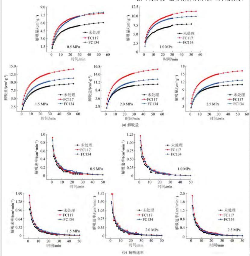 通過對干燥煤樣解吸量和解吸速率的分析,經(jīng)過氣潤濕反轉劑FC117和FC134處理后的煤樣解吸量和解吸速率均有所提升。定量地分析了氣潤濕反轉劑通過物理吸附的方式吸附在煤體表面,降低煤體表面自由能,增加煤樣解吸量,為氣潤濕反轉劑提高瓦斯抽采效果提供理論依據(jù)。
