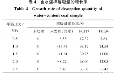 由圖6a可知,隨著甲烷吸附平衡壓力的增加,3種處理方式的含水煤樣解吸量均逐漸增加,且增加量均呈現(xiàn)逐漸減小趨勢。經(jīng)過氣潤濕反轉劑FC117和FC134處理后的含水煤樣解吸量始終大于未處理的煤樣,與干燥煤樣解吸量的規(guī)律基本一致。同時,在3種不同處理方式條件下,干燥煤樣的解吸量均大于含水條件下的解吸量,其結果表明在含水煤樣解吸過程中存在一定程度的水鎖效應。