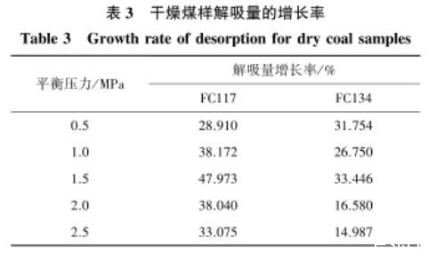 對干燥煤樣進行解吸試驗的測定,其目的主要是從定量的角度分析氣潤濕反轉劑通過降低煤體表面自由能,增加游離瓦斯量,進而促進瓦斯解吸。其中,在不同吸附平衡條件下,氣潤濕反轉劑處理后的煤樣解吸量均有所增加,增長率基本上呈先增加再降低的趨勢。在吸附平衡壓力達到1.5 MPa時,增長率達到最大值,分別達到近48%和34%,見表3。
