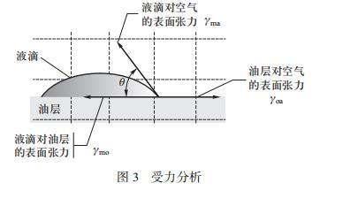 液滴爆炸現(xiàn)象的第二階段邊緣處的液滴產(chǎn)生液滴噴發(fā)現(xiàn)象,在該過程中液滴中部較厚的部分不斷向邊緣輸送液體,因此會穩(wěn)定持續(xù)一段時間。為解釋這一階段,先從表面張力入手,因為接觸角的不同,水對油的表面張力大于乙醇對油的表面張力,則混合液體對油層的界面張力介于水和乙醇之間?;旌弦旱沃幸掖嫉谋壤酱?,混合液體對油層的界面張力越小,受到向內(nèi)的張力減小,這樣整體向外的張力增大,這是產(chǎn)生向外推動的驅(qū)動力的重要原因。可見界面張力直接決定了液滴在界面上的擴散和運動。