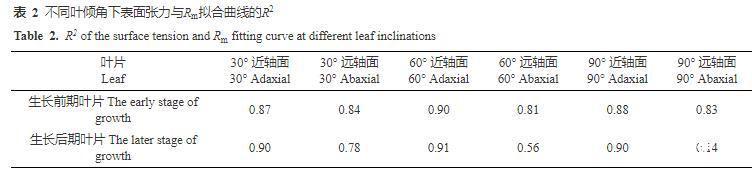 由表2結(jié)果可知,蘋果葉片生長前期近、遠軸面和生長后期近軸面,不同葉傾角下表面張力與Rm值擬合曲線的R2均高于0.80。而蘋果葉片生長后期遠軸面除30°時R2高于0.7外,其他葉傾角下均低于0.6,且隨著葉傾角增大,R2不斷減小,這表明蘋果葉片生長后期遠軸面的表面張力與Rm值之間的線性關系較差。
