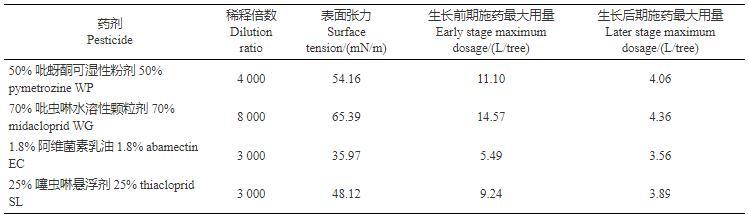 基于2.3節(jié)中表面張力與Rm值之間的關系,選取4種常用農(nóng)藥制劑(50%吡蚜酮可濕性粉劑、70%吡蟲啉水溶性顆粒劑、1.8%阿維菌素乳油和25%噻蟲嗪懸浮劑),測定其最大表面張力,結(jié)合果樹常用冠層參數(shù)(平均葉傾角、葉面積指數(shù)等)對果樹施藥用量進行預測評估,從而為大容量果樹精準用藥提供理論基礎。