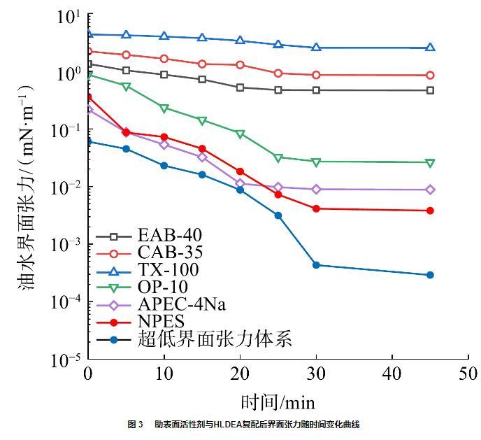 圖3助表面活性劑與HLDEA復(fù)配后界面張力隨時(shí)間變化曲線