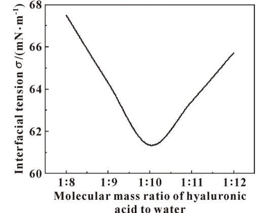 分子動力學(xué)中認(rèn)為界面張力與不同方向上的壓力張量有關(guān),仿生黏液透明質(zhì)酸體系-水的界面張力通過KIRKWOOD和BUFF提出的力學(xué)定義來進(jìn)行計算。通過對5個不同質(zhì)量比的體系在平衡后200 ps的數(shù)據(jù)進(jìn)行統(tǒng)計,得到了一個仿生黏液和水界面的界面張力平均結(jié)果,如圖1所示??梢娫谘芯康馁|(zhì)量比范圍內(nèi),透明質(zhì)酸仿生黏液與水的界面張力始終保持在(60.00±10)mN/m左右,其中透明質(zhì)酸和水分子的質(zhì)量比接近1∶10時,界面張力最小(為61.33 mN/m)。仿生黏液和水界面的界面張力越小,體系中仿生黏液和水界面的自由能就越低,界面就較穩(wěn)定。因此,可以認(rèn)為在研究的質(zhì)量比范圍內(nèi),質(zhì)量比1∶10時,模擬黏液-水的界面穩(wěn)定性最優(yōu)。這同時也證明,通過分子動力學(xué)模擬的方法可以初步預(yù)測仿生黏液在水體中的穩(wěn)定性。