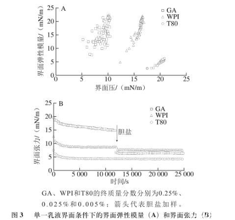 由圖3A可知,GA和WPI界面的彈性模量值基本一致,比T80界面的彈性模量值高很多。說明此質(zhì)量分?jǐn)?shù)條件下GA和WPI形成的界面相對(duì)T80有更好的界面黏彈性。這是由于大分子GA和WPI具有較強(qiáng)的空間位阻,在乳滴界面可形成較厚的吸附層,乳滴空間穩(wěn)定性較好,可在一定程度上抵御外力造成的變形。T80屬于小分子表面活性劑,在界面吸附致密整齊,但乳滴的空間穩(wěn)定性較差,易發(fā)生變形和聚集。圖3B表明,在加入膽鹽后,GA界面的界面張力降低值ΔT為8.42 mN/m,T80界面的界面張力基本不變,WPI界面的界面張力降低值ΔT為1.09 mN/m,由此證明T80的抗膽鹽取代能力最優(yōu),其次為WPI和GA。3種乳化劑所呈現(xiàn)的界面特性與3種乳液的消化動(dòng)力學(xué)規(guī)律相吻合。采用界面流變技術(shù)可有效評(píng)價(jià)乳化劑的界面特性,腸液組分對(duì)乳滴界面特性造成的影響以膽鹽取代最為顯著。因此,通過評(píng)價(jià)膽鹽在界面的取代能力,可在一定程度上判斷乳液的脂肪消化動(dòng)力學(xué)規(guī)律。