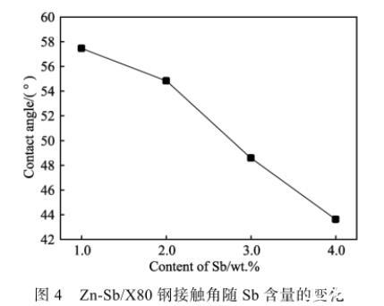 在實驗過程中,鋅合金熔體在基板上的潤濕時間很短,潤濕體系會很快達到平衡,且鋅合金熔體中Sb元素的添加量很少,根據Fe-Sb二元相圖可知,在450℃滴落溫度下,Fe與Sb之間的固溶度極小并無化合物生成,與X80鋼基板發(fā)生反應的元素主要是Zn,可以認為Sb添加對降低鋅液與X80鋼基體之間界面張力σsl的影響相對較小,由此Zn-Sb合金熔體與X80鋼基板之間的潤濕角主要取決于鋅合金熔體的表面張力σlv,表面張力σlv越小,接觸角越小,即鋅合金熔體與X80基板之間的潤濕性越好。