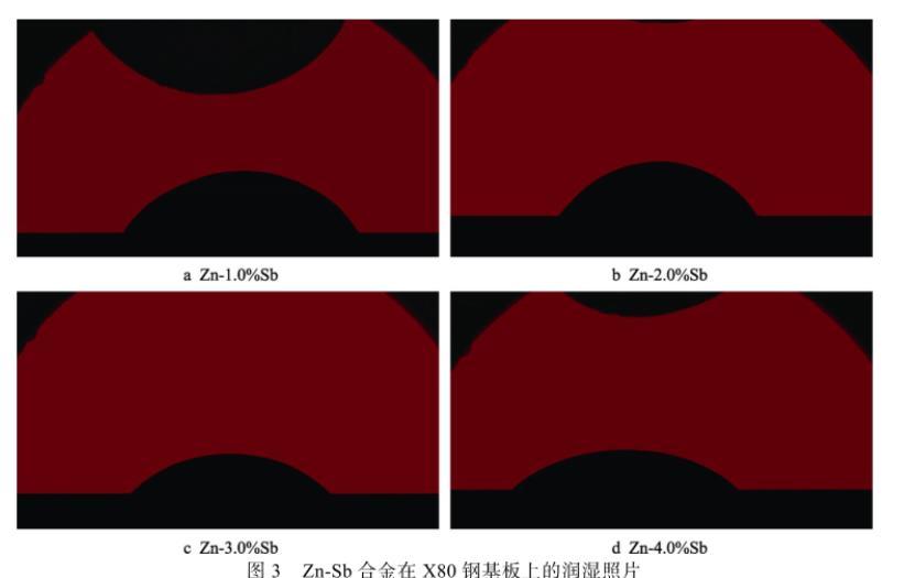 通常在基板沒有氧化的情況下,無論金屬/金屬體系之間是否存在界面反應,合金熔體與金屬基板之間總會潤濕,液態(tài)金屬與金屬基板之間的潤濕程度常用接觸角(θ)來度量,接觸角越小說明體系潤濕性越好。圖3為實驗條件下Zn-Sb合金熔體在X80鋼上的潤濕照片,不同Sb含量對鋅液與X80鋼基板間接觸角的影響如圖4所示。實驗結果表明,鋅液中添加少量Sb能有效改善其與X80鋼間的潤濕性??梢钥闯觯琙n-Sb/X80鋼接觸角隨Sb含量的增加而不斷減小,當Sb的質量分數為1.0%時,接觸角為57°左右;Sb的質量分數為4.0%時,接觸角達到最小,約為43°,此時潤濕效果最好。