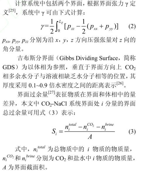 吉布斯分界面(Gibbs dividing surface,GDS)為以體相為參照,垂直于界面方向上CO2相多余水分子與溶液相缺乏水分子相等的位置,其厚度采用0.1~0.9倍水密度之間的距離表示。