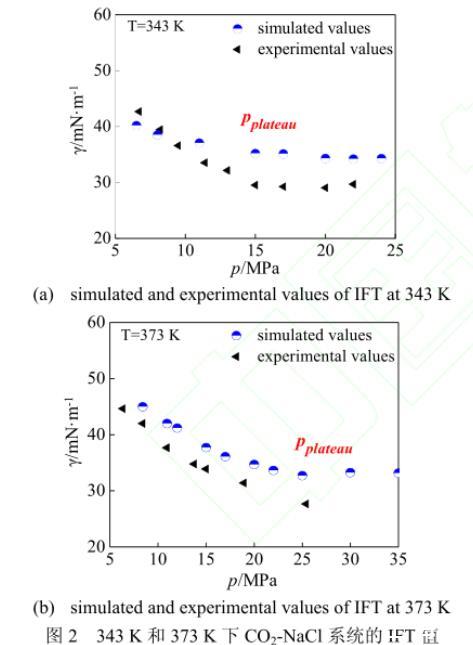 本文分別模擬了343 K和373 K的各壓強(qiáng)下鹽濃度為1.89 mol·L-1的CO2-NaCl系統(tǒng),IFT的計算結(jié)果示于圖2。由圖2可以看出,模擬所得的IFT值與Chalbaud等的實驗數(shù)據(jù)吻合較好。在溫度為343 K時[圖2(a)],IFT值隨著壓強(qiáng)的不斷升高,其減幅逐漸下降,最終在壓力平衡點pplateau=15 MPa之后達(dá)到穩(wěn)定值34 mN·m-1。373 K時[圖2(b)]的IFT值變化與343 K時極為相似,IFT值同樣隨著壓強(qiáng)的升高而下降,且下降速度不斷趨于平緩,由于高壓情況下實驗設(shè)備等因素受限制,實驗方法尚未得到25 MPa以上的數(shù)據(jù)點,故在實驗壓強(qiáng)范圍內(nèi)并未觀測到壓力平衡點。而本文應(yīng)用分子模擬的方法,成功模擬了25~35 MPa下的CO2-NaCl系統(tǒng),觀測到壓強(qiáng)在pplateau=25 MPa之后達(dá)到穩(wěn)定值33 mN·m-1。