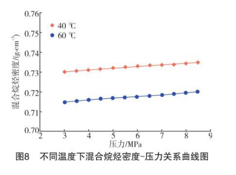 從混合烷烴密度-壓力曲線(見圖8)來看,整個(gè)測(cè)試壓力區(qū)間內(nèi)溫度對(duì)混合烷烴的密度影響不大,因此液體密度也不會(huì)造成界面張力的較大變化。從CO2密度-壓力曲線(見圖7)來看,溫度在中高壓下對(duì)CO2密度的影響較大。尤其是在3.5 MPa之后,60℃下的氣體密度隨著壓力升高速率明顯高于40℃時(shí)的速率。在同一壓力下,氣體密度隨著溫度升高顯著降低。密度較低的CO2氣體分子分布越稀疏,與烷烴液面直接接觸的氣體分子越少,故降低了二者發(fā)生萃取和混溶的概率,間接地導(dǎo)致液體的界面張力值增加。