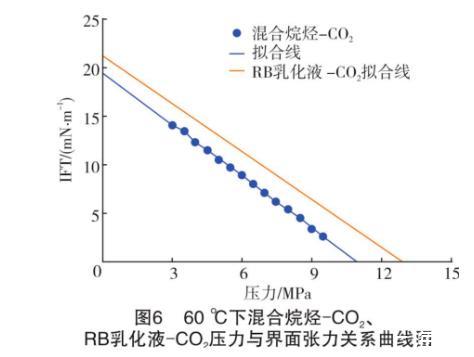 假設(shè)RB乳化液-原油不考慮斜率變化部分,始終以低壓階段(小于6 MPa)的斜率表示界面張力的變化。將表中同一溫度下不同系統(tǒng)的關(guān)系式展現(xiàn)在曲線圖上(見圖5和圖6)。從圖5和圖6可知,不論在哪個(gè)溫度下,混合烷烴和RB乳化液的壓力-界面張力曲線都接近平行,即兩種油的界面張力隨著壓力的升高幾乎以同樣的速度降低。計(jì)算得知,40℃和60℃下實(shí)驗(yàn)混合烷烴和RB原油的壓力-界面張力關(guān)系式中的斜率誤差為6.0%和8.6%??v觀兩種油的組成發(fā)現(xiàn),本實(shí)驗(yàn)所使用的混合烷烴中正十二烷的摩爾分?jǐn)?shù)達(dá)71.07%,而RB原油中的C12+的摩爾分?jǐn)?shù)達(dá)到57.66%。也就是說,混合烷烴和原油的組分中占主導(dǎo)作用的是高碳數(shù)的正構(gòu)烷烴。據(jù)姬澤敏等的大量實(shí)驗(yàn)研究,界面張力在不同的正構(gòu)烷烴-CO2體系中具有極好的規(guī)律性,在相同的溫度壓力條件下,正構(gòu)烷烴的碳數(shù)和界面張力成正比關(guān)系。從文獻(xiàn)中RB原油組成分析得知,C12+的分子量高達(dá)366 g/mol,而本實(shí)驗(yàn)中的混合烷烴的分子量?jī)H為156.74 g/mol。由此得知,實(shí)驗(yàn)誤差的主要來源是高碳正構(gòu)烷烴的組成不同。
